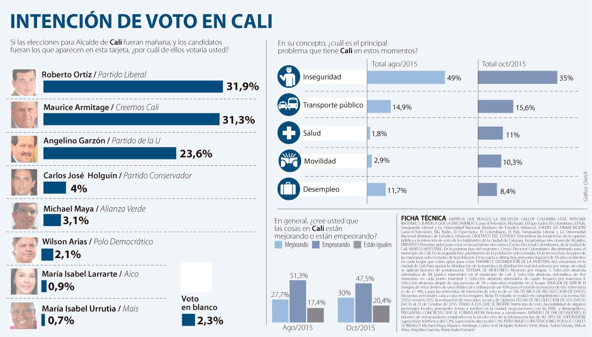 Roberto ‘Chontico’ Ortiz sería el virtual ganador con 31,9% de la intención de voto, seguido de Maurice Armitage con 31,3% y Angelino Garzón 23,6%.