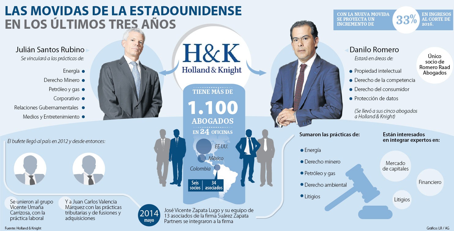 El más reciente (antes de la llegada de Romero y Santos) se dio en mayo de 2014, cuando LR hizo público que José Vicente Zapata Lugo y su equipo de 13 asociados (de la desaparecida Suárez Zapata Partners) se integraban a Holland & Knigh. Zapata Lugo le sumó experiencia a las áreas especializadas en energía, petróleo y gas, medio ambiente y litigios.