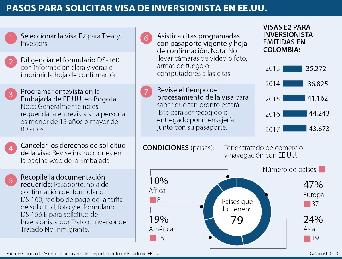 Para acceder a una visa de inversionistas para EE.UU., que se conocen como la visa E2, la persona que la solicite debe tener la ciudadanía de un país que tenga un tratado de comercio y navegación con Estados Unidos, pacto que maneja Colombia desde 1848 y que permite obtener este documento inicialmente por cinco años, para luego renovarse de forma indefinida.