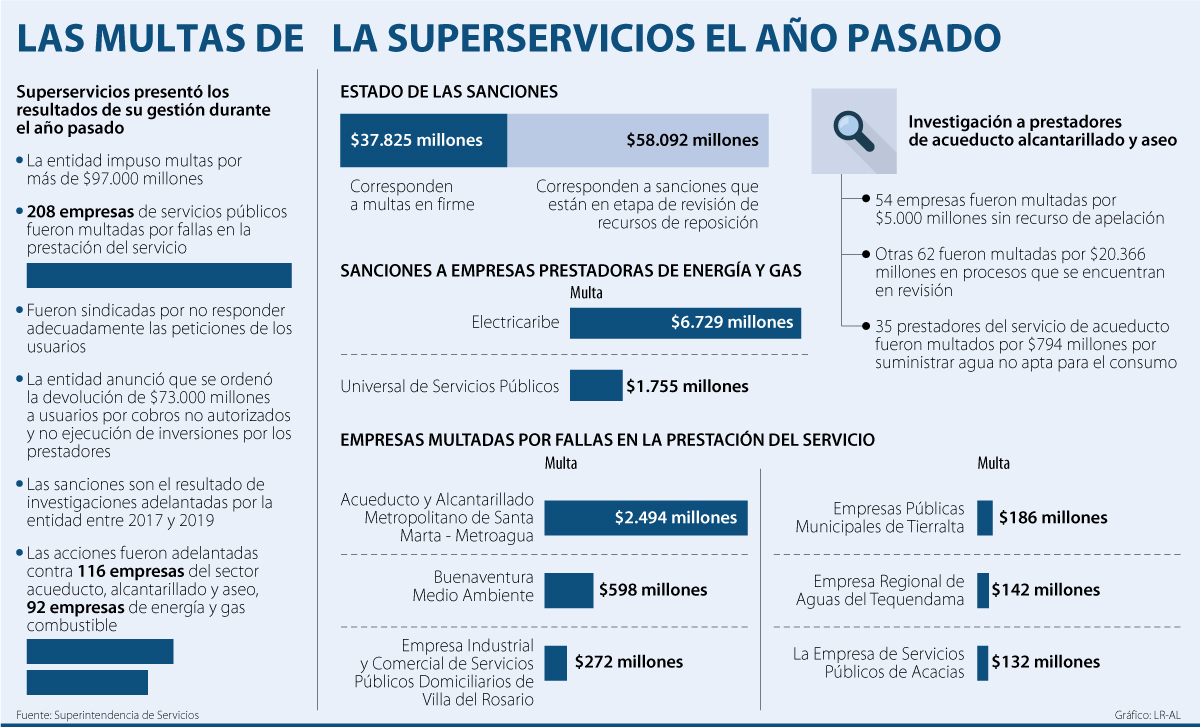 La labor de la Superservicios se concentró en generar sanciones económicas a las empresas del rubro de acueducto y alcantarillado que no cumplen con los requisitos como prestadores del servicio. Por esta razón, la entidad anunció que un total de 54 empresas tienen multas firmes por $5.000 millones, ademas de otras 62 organizaciones prestadoras del servicio que fueron sancionadas con $20.000 millones; no obstante, estos procesos todavía están en etapa de revisión.