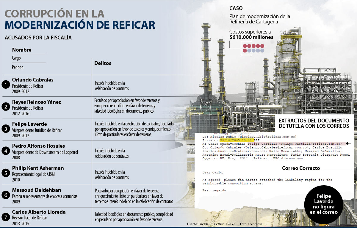 De acuerdo con la tutela, Laverde no aparece en ningún momento como destinatario ni como emisor. Al contrario, es la persona de apellido Castilla la que aparece en estos correos que habría adelantado por petición de Reficar las negociaciones con las empresas Chicago Bridge & Iron (CBI) y Technip para determinar cuál se quedaría con la construcción de la ampliación de la refinería de Cartagena.