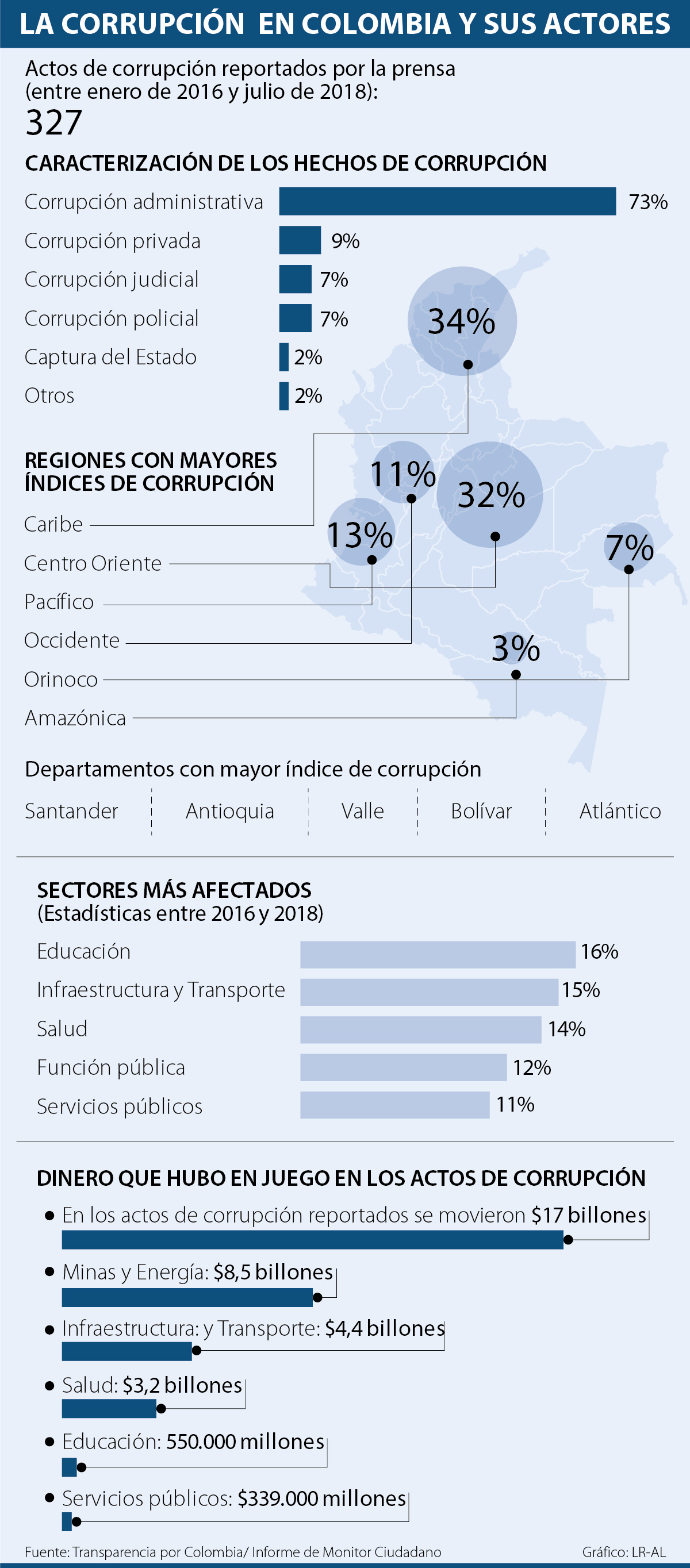 Entre enero de 2016 y julio de 2018, la prensa nacional y regional registró 327 actos de corrupción en todo el país, lo que significa que en promedio se cometieron al mes casi 11 hechos de este tipo, la mayoría en las regiones, según reveló Transparencia por Colombia en su informe más reciente.