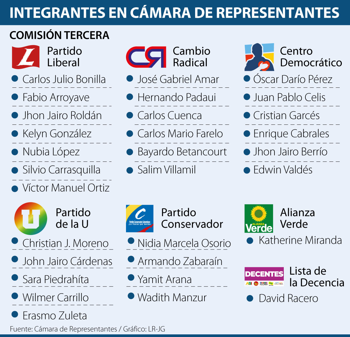 Juan Fernando Reyes Kuri, del Partido Liberal, por ejemplo, estará en la Comisión Primera encargada de las reformas constitucionales, mientras que Rodrigo Rojas del Partido Liberal quedó en la Comisión Sexta que se dedica al ordenamiento territorial, entre otras. La Comisión Tercera, relacionada con temas de Hacienda y Crédito Público, quedó integrada en la cámara baja por 30 representantes de siete partidos.
