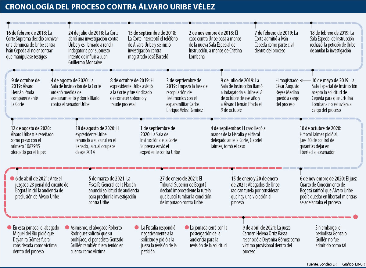 Desde el pasado 5 de marzo de 2021, el caso contra el expresidente Álvaro Uribe tomó un nuevo rumbo cuando el fiscal delegado, Gabriel Jaimes, solicitó una audiencia para la preclusión del caso. Uribe enfrenta desde octubre de 2019 cargos por supuestos sobornos, fraude procesal y manipulación de testigos.