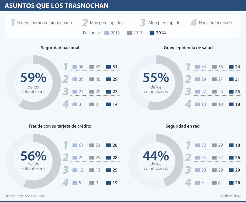 Enfrentar conflictos con otros países y convertirse en un país vulnerable en términos de seguridad, están entre las preocupaciones que más aquejan a los colombianos. Así quedó demostrado en el estudio de seguridad realizado en marzo 2014 por Unisys Security Index, que entrevistó a 510 personas mayores de edad.