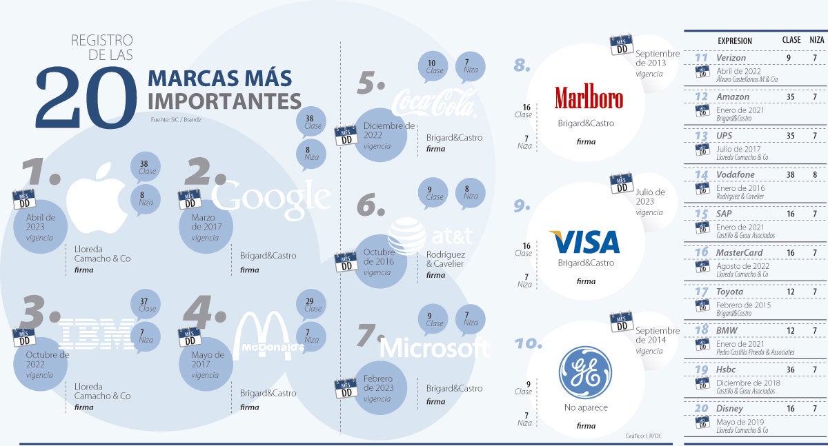 Seis firmas de abogados que compiten en el mercado local se reparten el registro de las 20 marcas de mayor valor en el mundo. Cada año, BrandZ edita una publicación con las marcas más importantes del mundo, que lideran Apple, Google, IBM, McDonald’s y Coca-Cola, entre otras.