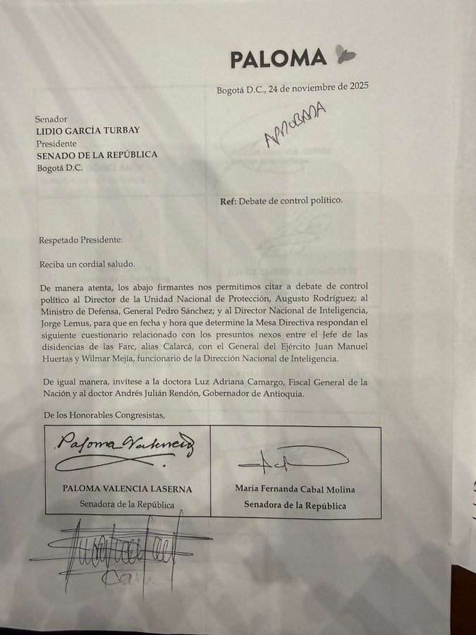 “Los firmantes nos permitimos citar a debate de control político al Director de la Unidad Nacional de Protección, Augusto Rodríguez; al ministro de Defensa, General Pedro Sánchez; y al Director Nacional de Inteligencia, Jorge Lemus, para que en fecha y hora que determine la Mesa Directiva respondan el siguiente cuestionario relacionado con los presuntos nexos entre el Jefe de las disidencias de las Farc, alias Calarcá, con el General del Ejército Juan Manuel Huertas y Wilmar Mejía, funcionario de la Dirección Nacional de Inteligencia”, aseguró la carta.