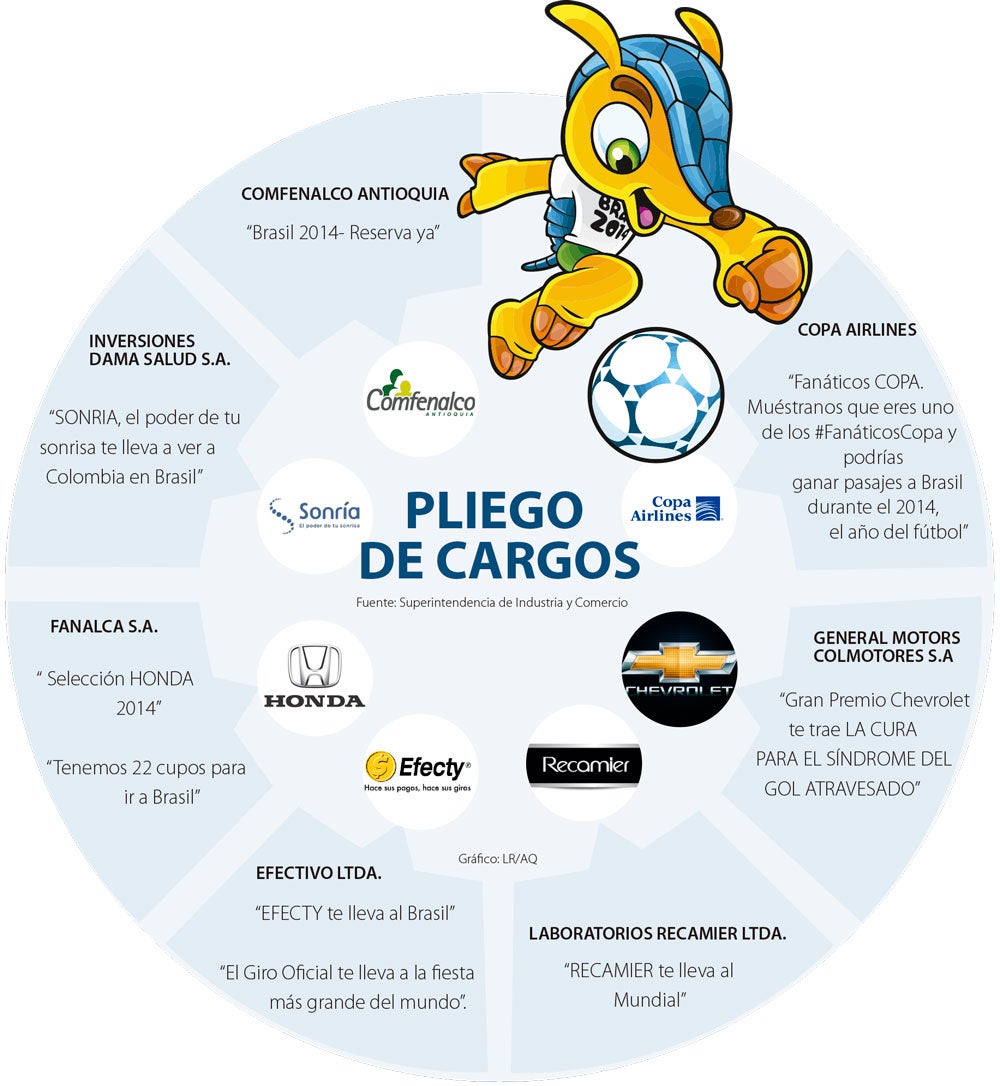 Luego del análisis que la Superindustria hizo de las piezas publicitarias de varias empresas que anunciaban incentivos (premios) relacionados con la Copa Mundial de la FIFA Brasil 2014, evidenció que Copa Airlines, GM Colmotores, Honda, Efecty, Recamier, Sonria y Comfenalco Antioquia habrían omitido su obligación de anunciar expresamente en sus piezas publicitarias, si los incentivos (premios) incluían boletas para asistir a los partidos de fútbol y, en caso de incluirlas, la mención a que cuentan con la autorización del organizador del evento (FIFA).