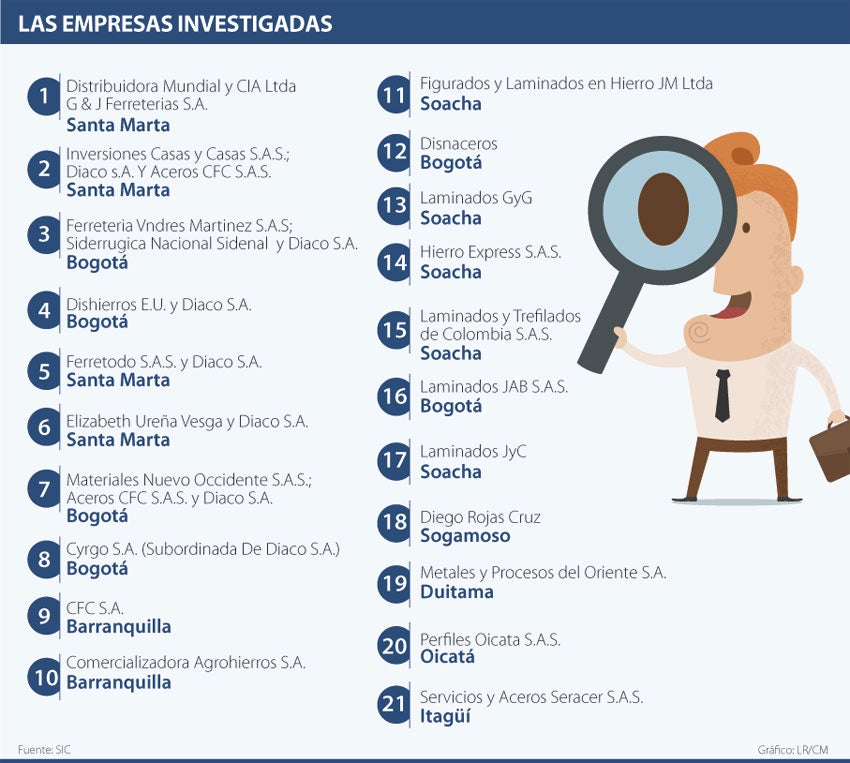 El grupo contiene 21 nombres aunque la entidad tiene abiertas hasta el momento, 34 investigaciones. La Distribuidora Mundial y CIA Ltda y G & J Ferreterías S.A., Inversiones Casas y Casas S.A.S. Diaco S.A. y Aceros CFC S.A.S., Ferreteria Andres Martinez S.A.S; Siderrugica Nacional sidenal y Diaco S.A., Dishierros E.U. y Diaco S.A., Ferretodo S.A.S. y Diaco S.A. y Elizabeth Ureña Vesga y Diaco S.A., son las seis que encabezan el ranking de las que tienen cuentas pendientes con la entidad dirigida por Pablo Felipe Robledo, funcionario que advirtió será implacable con las firmas a las que se les compruebe la falta, una vez concluidos los procesos. Así lo dejó claro durante una reunión que se realizó el pasado miércoles con Alejandro Giraldo, superintendente delegado para reglamentos técnicos y metrología legal de la SIC, Jairo Reyna Niño presidente del Grupo Siderúrgico Reyna; Miguel Holmes, presidente ejecutivo de Ternium Colombia; Maurice Armitage, presidente de Siderúrgica de Occidente, Sidoc S.A.; Juliana Ocampo, vicepresidente de relaciones institucionales de Acerías Paz del Río; Bruce Mac Master, presidente de la Asociación Nacional de Empresarios de Colombia, Andi; Sandra Forero, presidente de Camacol y Luis Felipe Henao, ministro de Vivienda.