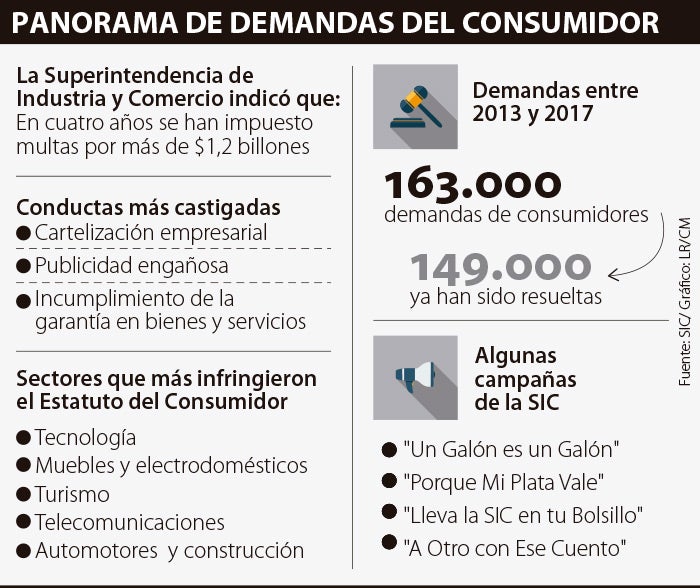 Según la entidad, los sectores que más infringieron el Estatuto del Consumidor (Ley 1480 de 2011), afectando a los usuarios, fueron el de tecnología, telecomunicaciones, muebles y electrodomésticos, turismo, automotores y construcción, debido a que incurren en prácticas indebidas, tales como la cartelización empresarial, la publicidad engañosa, el incumplimiento de la garantía en bienes y servicios, la inobservancia de órdenes e instrucciones impartidas y la usura.