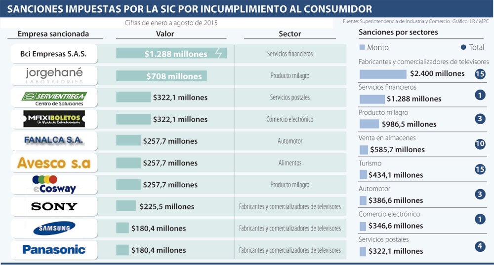 En lo corrido del año, la SIC ha impuesto $8.047 millones, pero solo el primer sector, las empresas fabricadoras y comercializadoras de televisores, registra un total de 15 multas, que superan $2.400 millones, y que fueron impuestas a empresas como Sony ($225 millones), Samsung ($180 millones) y Panasonic ($180 millones). La razón: no haber informado a los consumidores sobre la compatibilidad con la Televisión Digital Terrestre.