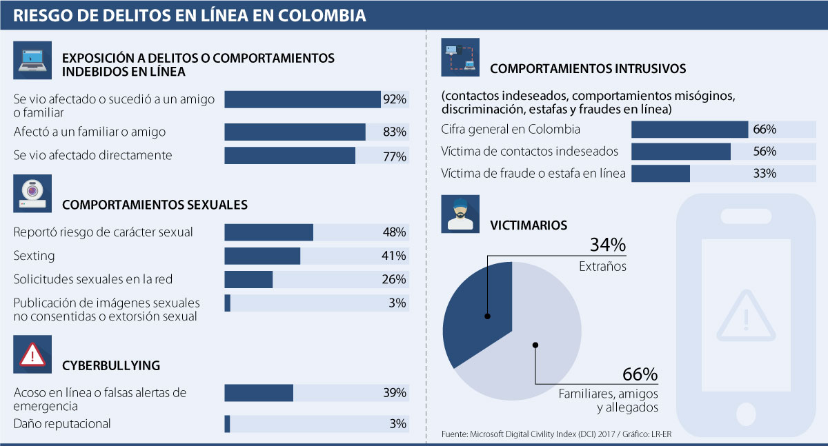 De acuerdo al más reciente índice de civismo digital de Microsoft, de los 23 países analizados, entre los que se encuentran Argentina, Australia, Estados Unidos, Francia y Alemania; Colombia ocupó el tercer lugar con mayor nivel de exposición a riesgos en línea.