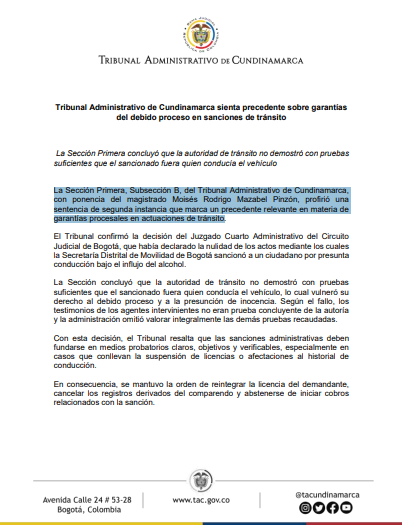 “El Tribunal confirmó la decisión del Juzgado Cuarto Administrativo del Circuito Judicial de Bogotá, que había declarado la nulidad de los actos mediante los cuales la Secretaría Distrital de Movilidad de Bogotá sancionó a un ciudadano por presunta conducción bajo el influjo del alcohol”, aseguró el Tribunal en la carta.