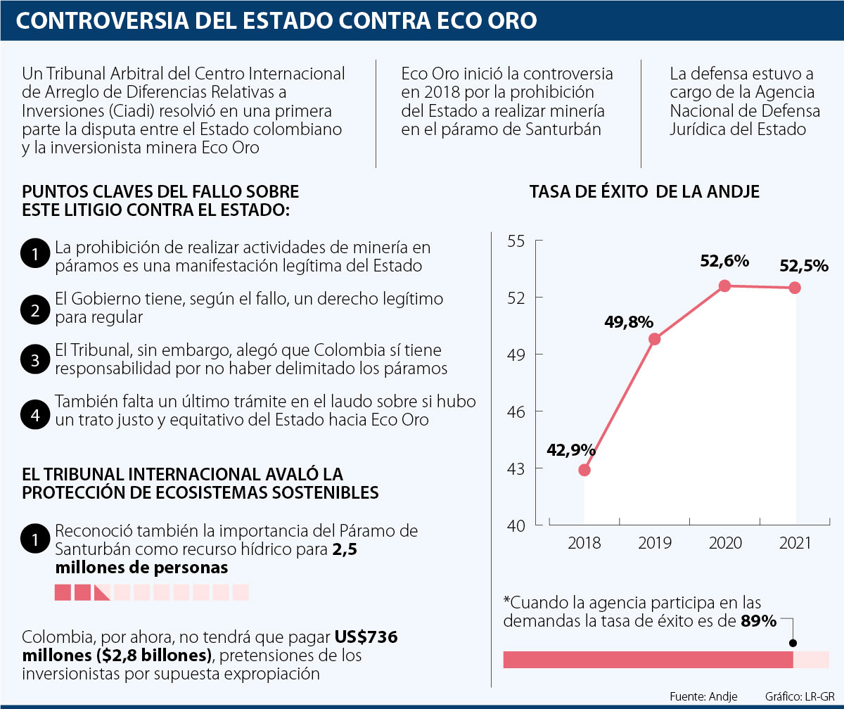 La Andje explicó que con la decisión el país está exento, hasta el momento, de pagar US$ 736 millones, pretensión de minera Eco Oro