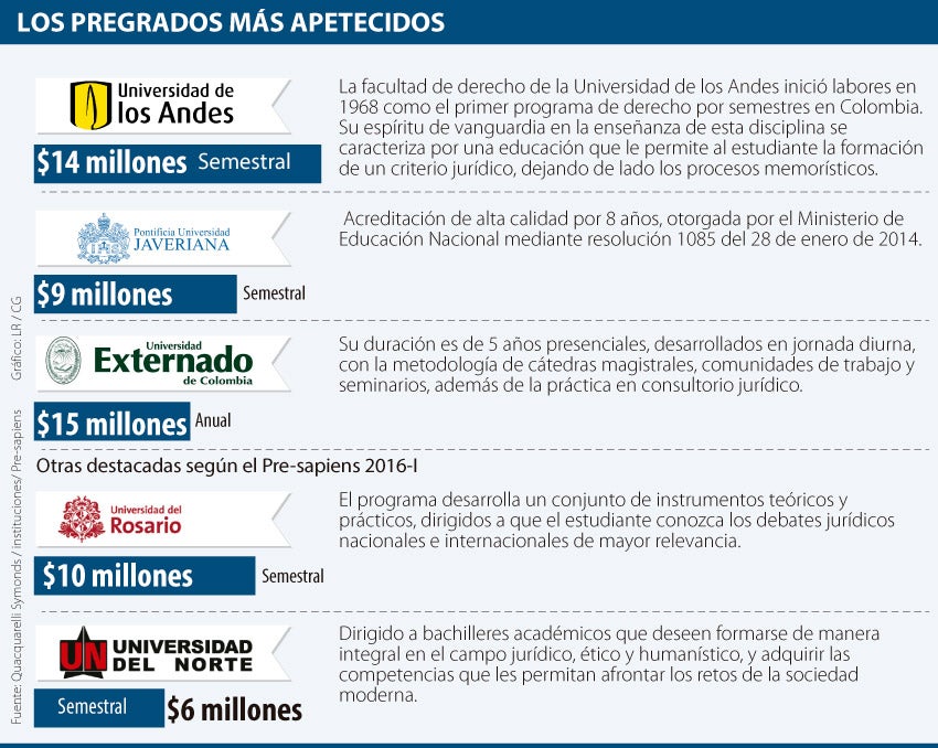 Según el escalafón, la Universidad de los Andes fue la colombiana mejor rankeada en Derecho. Esta facultad inició labores en 1968 como el primer Programa de Derecho por semestres en Colombia. El pregrado de leyes en Los Andes este año tiene un valor de $ 14 millones.