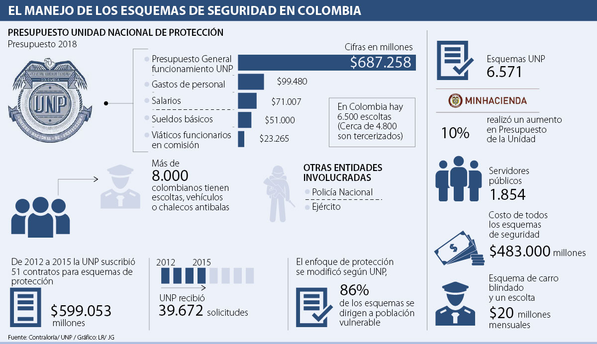 Según un funcionario de la UNP, a Colombia le cuesta $483.000 millones mantener los cerca de 6.500 esquemas de seguridad autorizados, cifra que concuerda con el rubro de funcionamiento destinado por la entidad. Adicionalmente, en la última licitación la entidad destinó cerca de $213.000 millones para alquilar diferentes tipos de vehículos blindados.