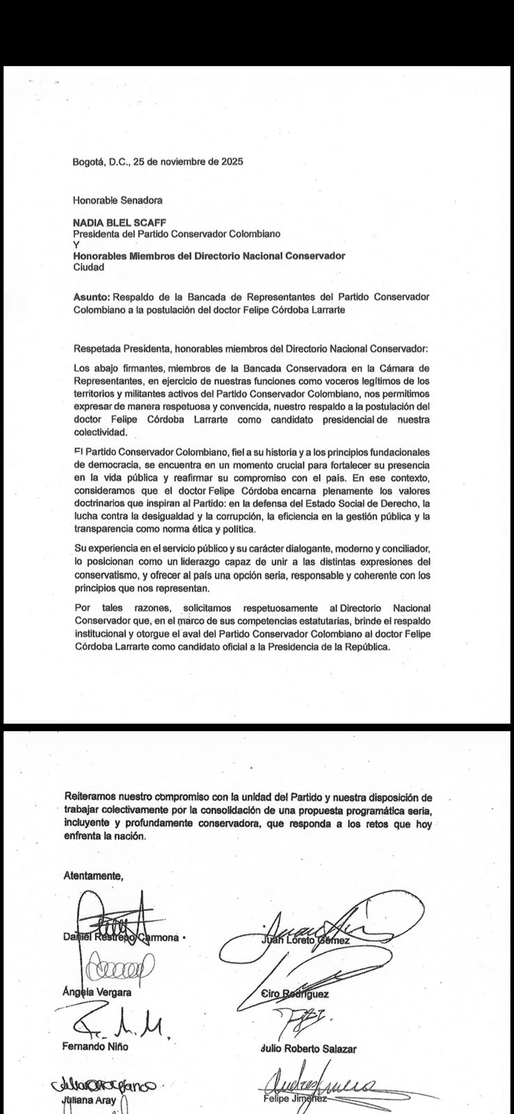 "Los abajo firmantes, miembros de la bancada conservadora en la Cámara de Representantes, en ejercicio de nuestras funciones como voceros legítimos de los territorios y militantes activos del Partido Conservador Colombiano, nos permitimos expresar de manera respetuosa y convencida, nuestro respaldo a la postulación del doctor Felipe Córdoba Larrarte como candidato presidencial de nuestra colectividad", dijo.