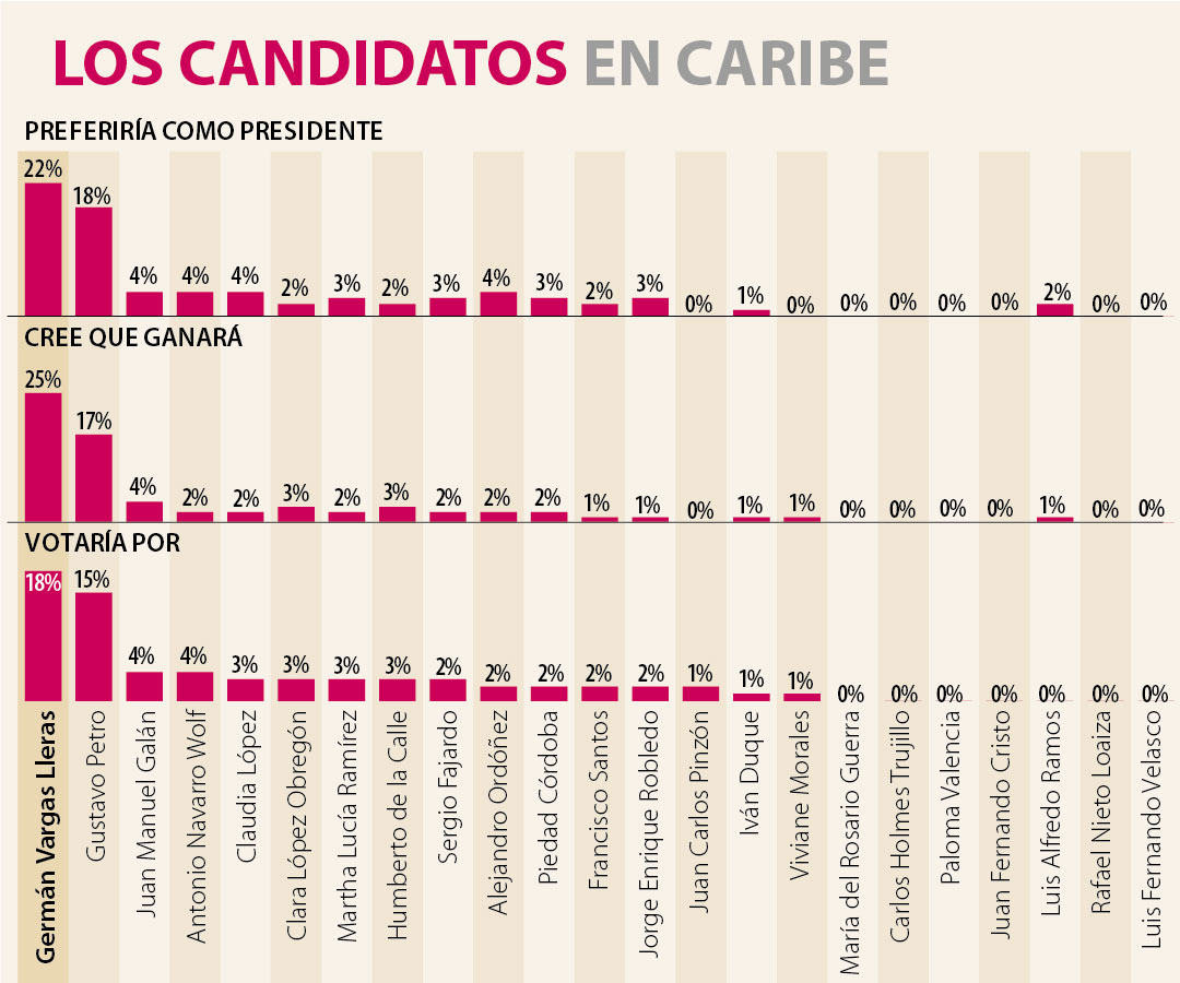 La tendencia es similar frente a la pregunta de quién preferirían los encuestados del caribe como primer mandatario. Vargas Lleras obtuvo la opinión de 22% de los encuestados, mientras Petro se quedó con 18%, y Fajardo no pasó de 3%. Además, mientras Claudia López, Galán y Clara López obtuvieron 4%, Duque, Morales, Holmes Trujillo y Nieto Loaiza registran 0% de preferencia en esta región.