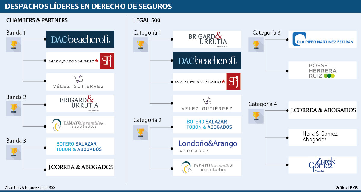 Así mismo, la firma Brigard & Urrutia también figuro a la cabeza del área según Legal 500, un logro que también vale la pena destacar, aunque se ubicó en la banda 2 de C&P. También, otras firmas como Tamayo Jaramillo & Asociados, Botero Salazar Tobón & Abogados y Posse Herrera Ruiz figuran entre los 12 despachos con más reconocimiento en la práctica de seguros, un mercado que según los litigantes expertos ha crecido en el país debido a la globalización.