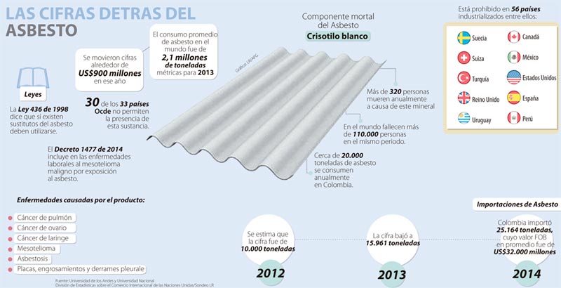De acuerdo con la Conferencia Internacional y Ocupacional desarrollada en 2014 por la Universidad de los Andes en compañía de la Universidad Nacional, se calcula que en el país, más de 320 personas mueren anualmente a causa de este mineral, que está prohibido en 56 países industrializados como: Estados Unidos, Canadá, Suiza, Reino Unido, Turquía, Uruguay, México, Perú y otros.