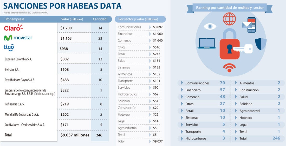 Las multas por infracciones de habeas data (protección de datos personales) sumaron $9.037 millones entre 2012 y 2015; y Claro, Movistar y Tigo fueron las compañías con más multas en los tres años, según la Superintendencia de Industria y Comercio (SIC).