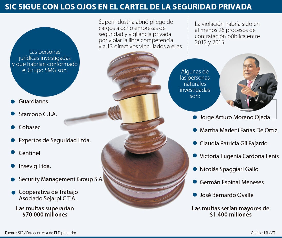 Hace menos de dos meses, la SIC tomó la decisión de multar con más de $26.000 millones a siete empresas y 17 personas naturales que conformaban un cartel de la vigilancia que, de igual forma, manipuló procesos de contratación por cerca de $70.000 millones entre 2009 y 2012.