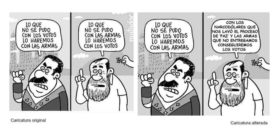 El exprecandidato presidencial, Óscar Iván Zuluaga, compartió, en su cuentas de Facebook y Twitter, una caricatura de Julio César González “Matador”, en la cual se veía al presidente de Venezuela, Nicolás Maduro decir que “lo que no se pudo con los votos, lo haremos con las armas”, mientras que a su derecha aparecía Rodrigo Londoño, alias “Timochenko”, con un globo de texto en el que se leía “con los narcodólares que nos lavó el proceso de ‘paz’ y las armas que no entregamos conseguiremos los votos”.