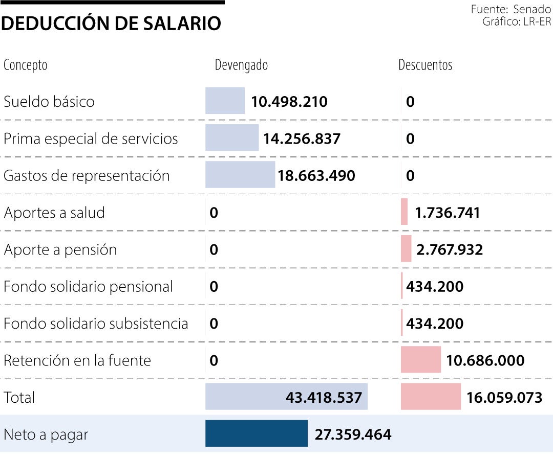Del sueldo actual de los congresista de $43.418.537, se les descuenta $1.736.741 por servicio de salud, $2.767.932 por pensión, $434.200 por el fondo de solidaridad pensional, $434.200 solidaridad por subsistencia, $10.686.000 por retención en la fuente, para un neto al mes pagado de $27.359.464.