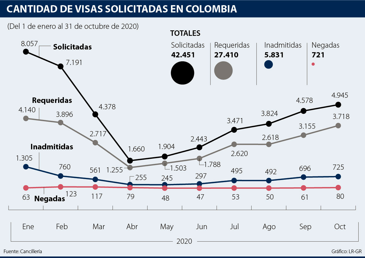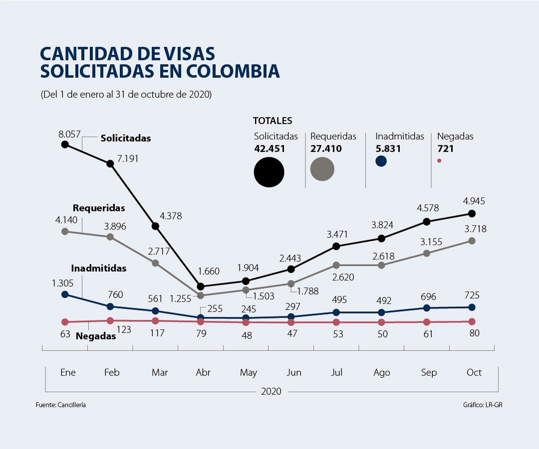 Del 1 de enero al 31 de octubre se solicitaron 42.451 visas, y 27.410 fueron requeridas por falta de documentación