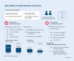 Lo primero que hay que tener en cuenta es que, en la ley, están contemplados dos tipos de sociedades en las relaciones sentimentales: la conyugal, que es la comunidad de bienes que se constituye entre los cónyuges por el matrimonio; y la patrimonial de hecho, que es la comunidad de bienes que se constituye entre los compañeros permanentes cuando la unión marital de hecho dura más dos años.