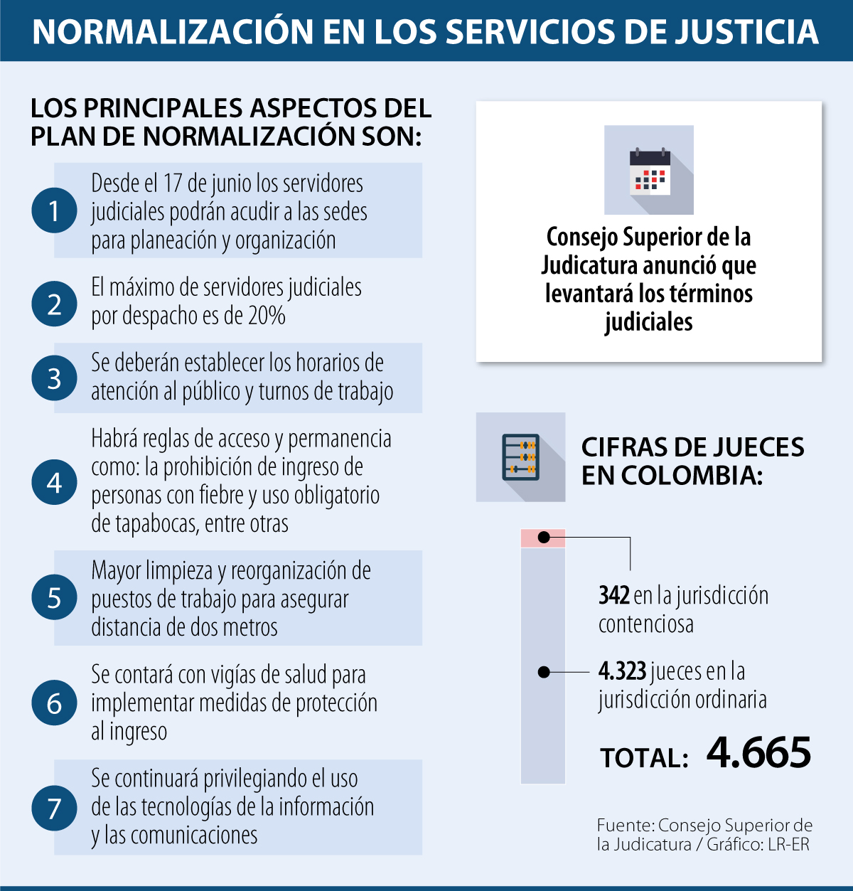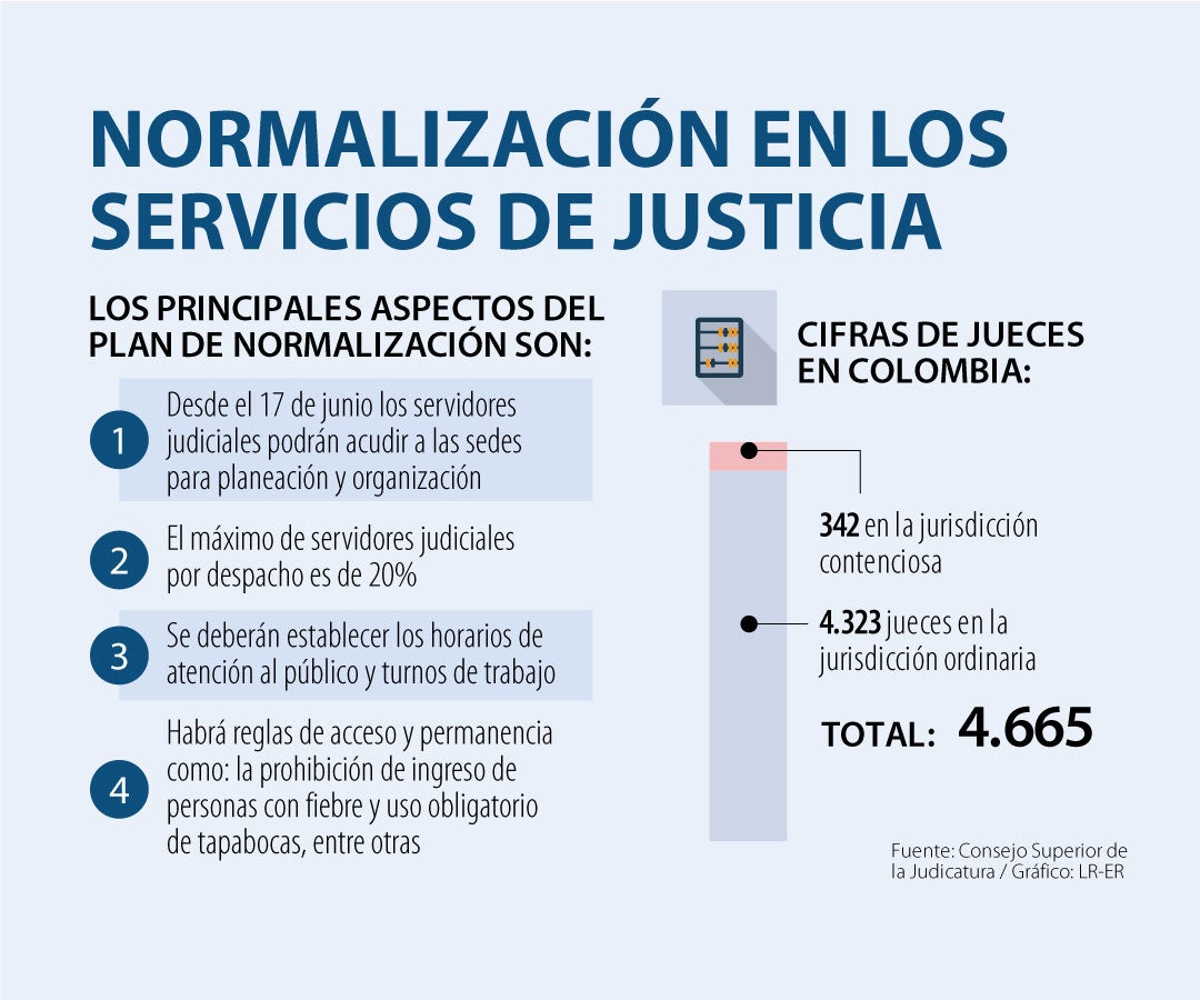Entre uno de los planes de normalización de la Judicatura está el de que los juzgados tengan aforos que no superen 20%. Igualmente, se estableció que se continuará promoviendo y privilegiando el uso de las tecnologías de la información y las comunicaciones para el acceso de los ciudadanos a la justicia.