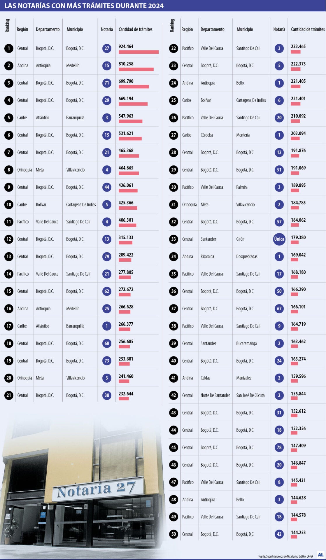 El top cinco lo completan la Notaría 29 de Bogotá, a cargo de Daniel Ricardo Palacios Rubio, con 669.194 trámites, y la Notaría Tercera de Barranquilla, dirigida por Alfonso Luis Ávila Fadul, con 547.963.