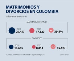 Las medidas de aislamiento para contener la pandemia del covid-19, con las restricciones de movilidad y acceso a trámites que se impusieron, pueden ser una de las explicaciones para la caída que han presentado este año los divorcios y matrimonios.