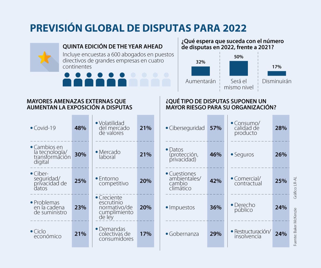 Lo primero que revela el informe es que la mitad de los encuestados espera que el volumen de disputas se mantenga, para 2022, en el mismo nivel del año pasado; sin embargo, llama la atención que son más los pesimistas que esperan que estas aumenten (32%) que quienes proyectan que se reducirán (17%).