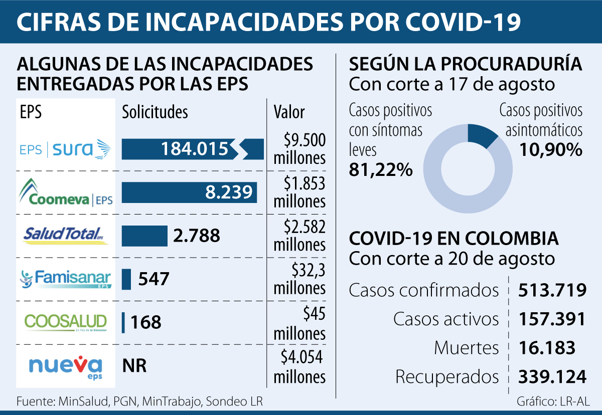 Esto, en otras palabras, quiere decir que los médicos no están obligados a entregar incapacidades laborales a quienes sean asintomáticos o presenten síntomas leves. Según el Ministerio Público, con corte al 17 de agosto, los primeros representaban 10,9% de los casos, mientras que los últimos son 81,22% de los contagiados con el virus. Cabe recordar que los lineamientos del Ministerio de Salud señalan que la persona que sea diagnosticada con covid-19 debe guardar un aislamiento obligatorio de 14 días.