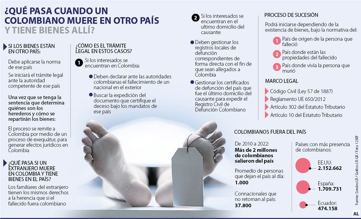 En términos del trámite legal para la sucesión de bienes, de acuerdo con Marilyn Valencia, asistente legal en asuntos de familia de Riveros Victoria Abogados, explicó que si los interesados se encuentran en Colombia deben declarar ante las autoridades colombianas el fallecimiento de un nacional en el exterior para que con ayuda de las autoridades se realice una cooperación internacional que permita la expedición del documento que certifique el descenso bajo los mandatos de ese país.