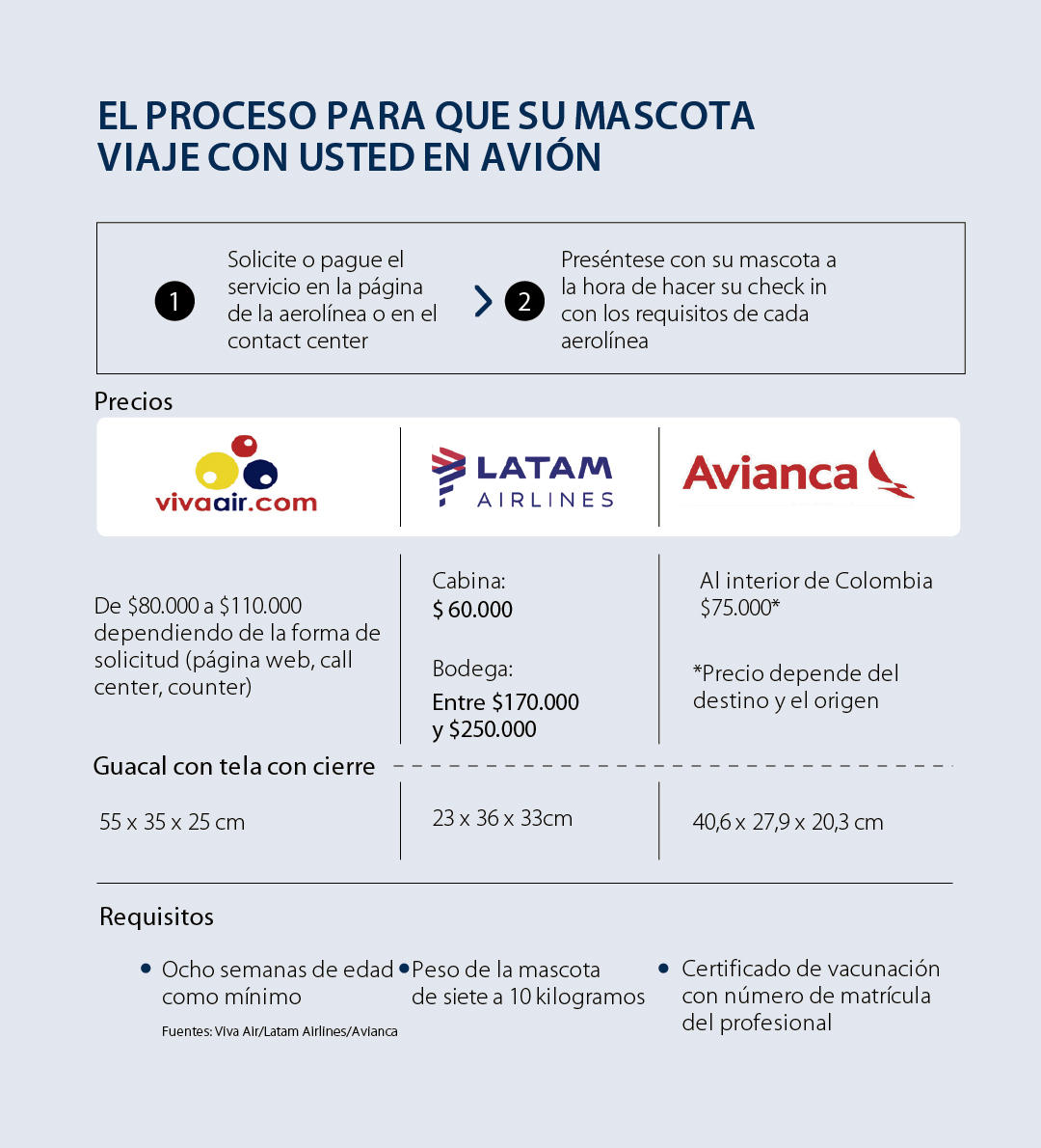 Este es el caso de Viva Air, compañía que tiene un servicio adicional para que los clientes viajen con su gato o tu perro, el cual se puede adquirir al momento de comprar el tiquete por la página web como servicio ‘a la carta’. Latam Airlines, por su parte también tiene la posibilidad de llevar una mascota en cabina, con la diferencia de que el pasajero debe hacer el proceso a través del contact center o una oficina de ventas.