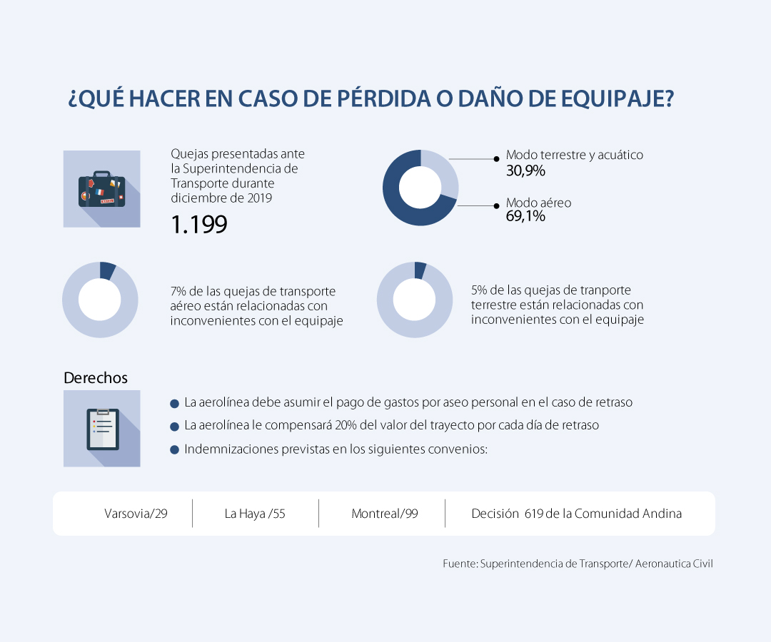 Durante diciembre, se registraron más de 1.000 quejas, peticiones y reclamos ante la Superintendencia de Transporte relacionados con inconvenientes con el equipaje. Es por ello que, en el mes en el que la mayoría de colombianos regresan de sus vacaciones resulta necesario tener en cuenta los derechos del pasajero en caso de pérdida o daño de equipaje tanto en transporte aéreo como en terrestre y acuático.