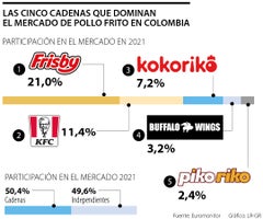 Las cadenas de pollo frito que lideran este mercado son Frisby, KFC y Kokoriko, con 21%, 7,2% y 11,4% de participación, respectivamente. El top cinco lo completan Buffalo Wings, con 3,2%; y finaliza Piko Riko, con 2,4%. En total, las grandes cadenas que venden este producto suman una participación de 50,4%.