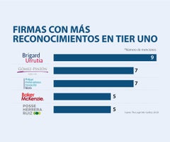En el tercer lugar se evidenció un triple empate este año, con seis menciones en Tier uno para las firmas Gómez-Pinzón Abogados (GPA), Posse Herrera Ruiz y Baker Mckenzie.