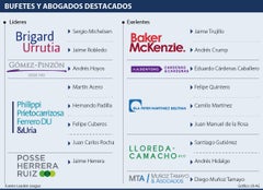 Luego de ellos, se dio a conocer el nombre de las firmas recomendadas por Leaders League entre las que aparecieron bufetes que se encuentran en el país como Álzate & Asociados Asesores Jurídicos, DLA Piper Martínez Beltrán, Márquez Robledo, Marrugo Rivera & Asociados, MS Legal, Peña Mancero y Triana Uribe & Michelsen.