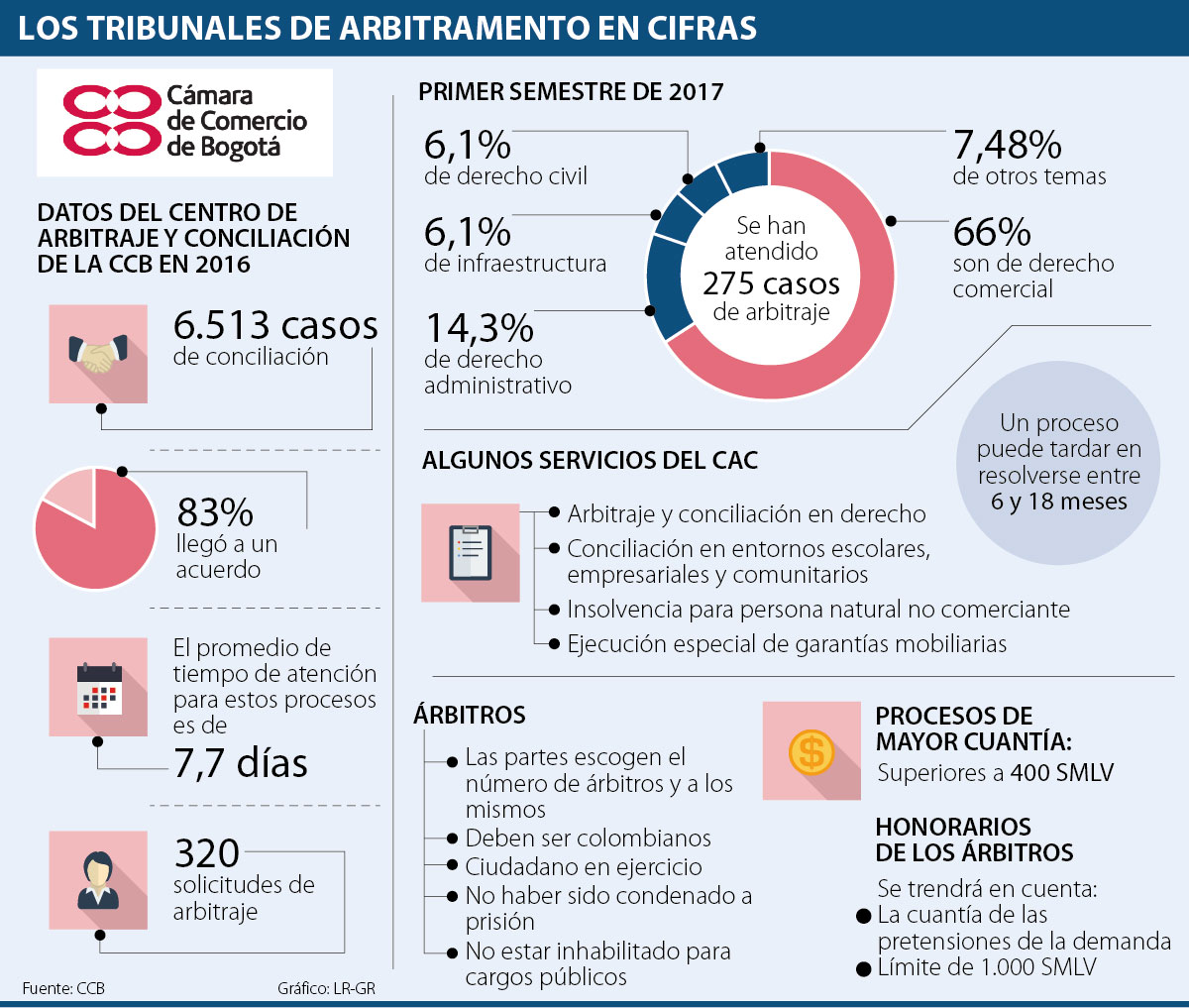Según el Centro de Arbitraje y Conciliación (CAC) de la Cámara de Comercio de Bogotá (CCB), en el primer semestre ha atendido 275 casos de arbitraje, de los cuales 66% tienen que ver con derecho comercial, mientras que 14% con derecho administrativo y 6% con infraestructura.