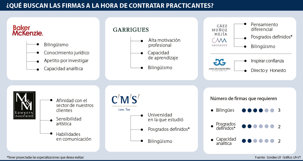 Para muchos de los bufetes a los que se les consultó es muy relevante en cuanto a herramientas técnicas, ser bilingües, especialmente saber inglés, tener claridad en los conceptos jurídicos y poder resolver los casos en las áreas en las que se especializa la firma.