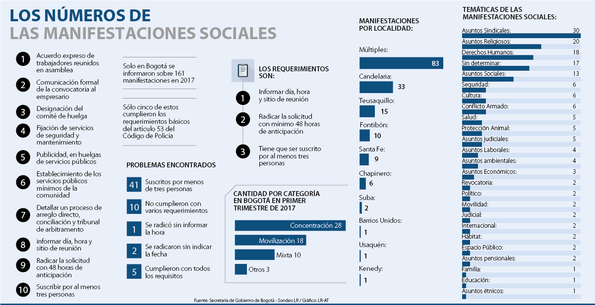 En Bogotá, así como en Colombia, todas las manifestaciones que una comunidad o un sector social quieran desarrollar, debe ser informado a la Secretaría de cada ciudad o las respectivas entidades municipales, informando el día, la hora y los lugares exactos de la reunión, con el fin de que los entes administrativos puedan garantizar el orden y la protección de los manifestantes.