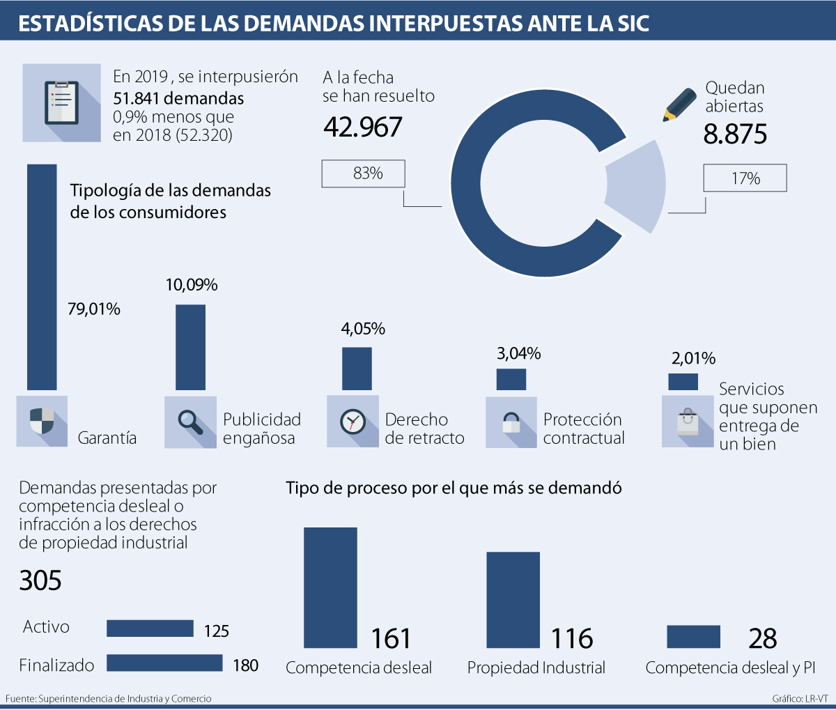 Respecto a las demandas por competencia desleal o infracción a los derechos de propiedad industrial, la Superindustria indicó que el año pasado se interpusieron 305, de las que ya se han resuelto 59% frente a 41% que siguen abiertas. De ellas, 53% fueron por actos que suponían competencia desleal, seguido de 38% que se dio por propiedad industrial.