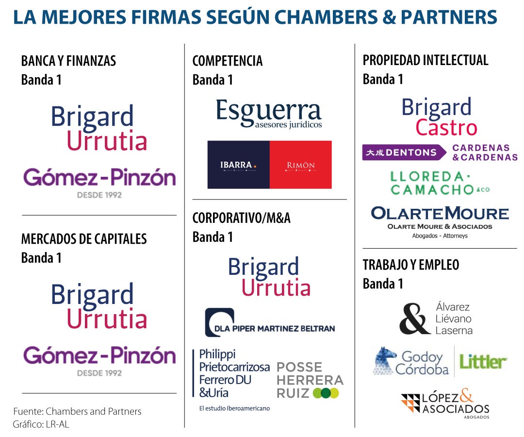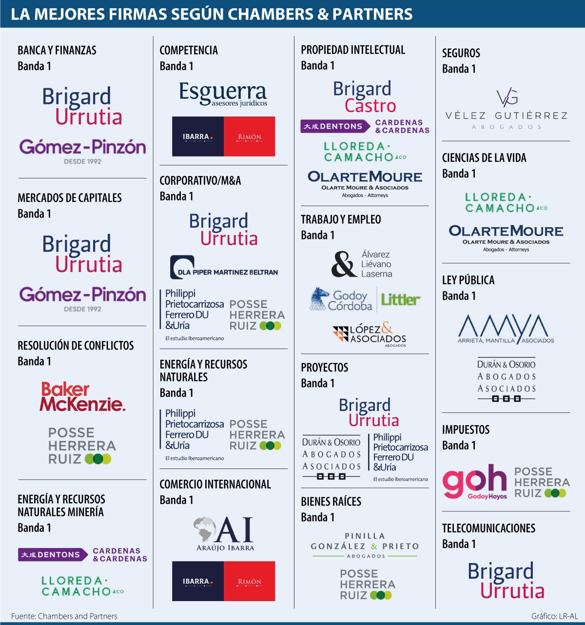 En esta ocasión, las firmas que aparecen en esa posición en más áreas son Brigard Urrutia y Posse Herrera Ruiz, ambos bufetes con cinco menciones en el ranking. Seguidas de estas firmas está Philippi Prietocarrizosa Ferrero DU & Uría y Lloreda Camacho & Co, ambas con tres menciones.