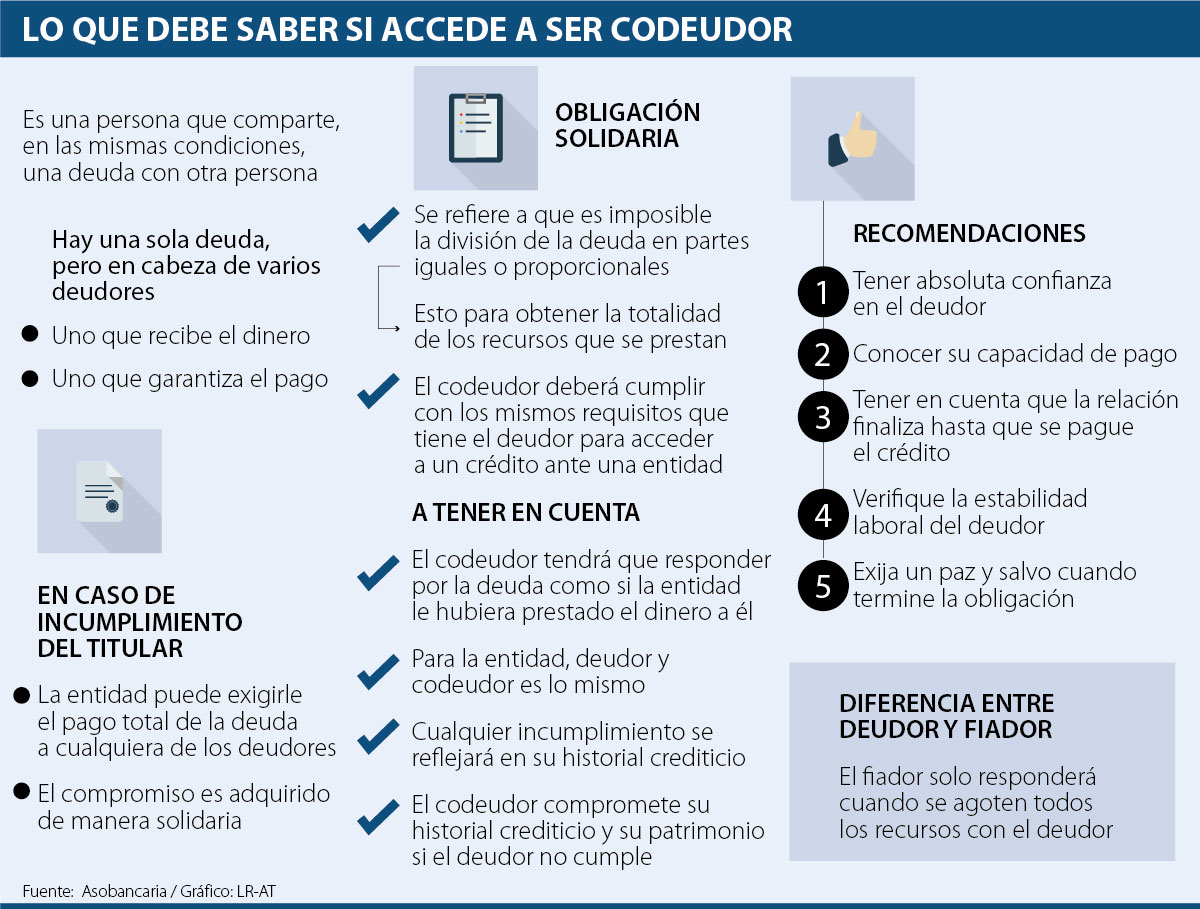 En caso de acceder, usted quedará con una obligación solidaria, que significa que “es imposible hacer la división de la deuda en partes iguales o proporcionales”. Según Asobancaria, esto para “obtener la totalidad de los recursos que prestó la entidad”.