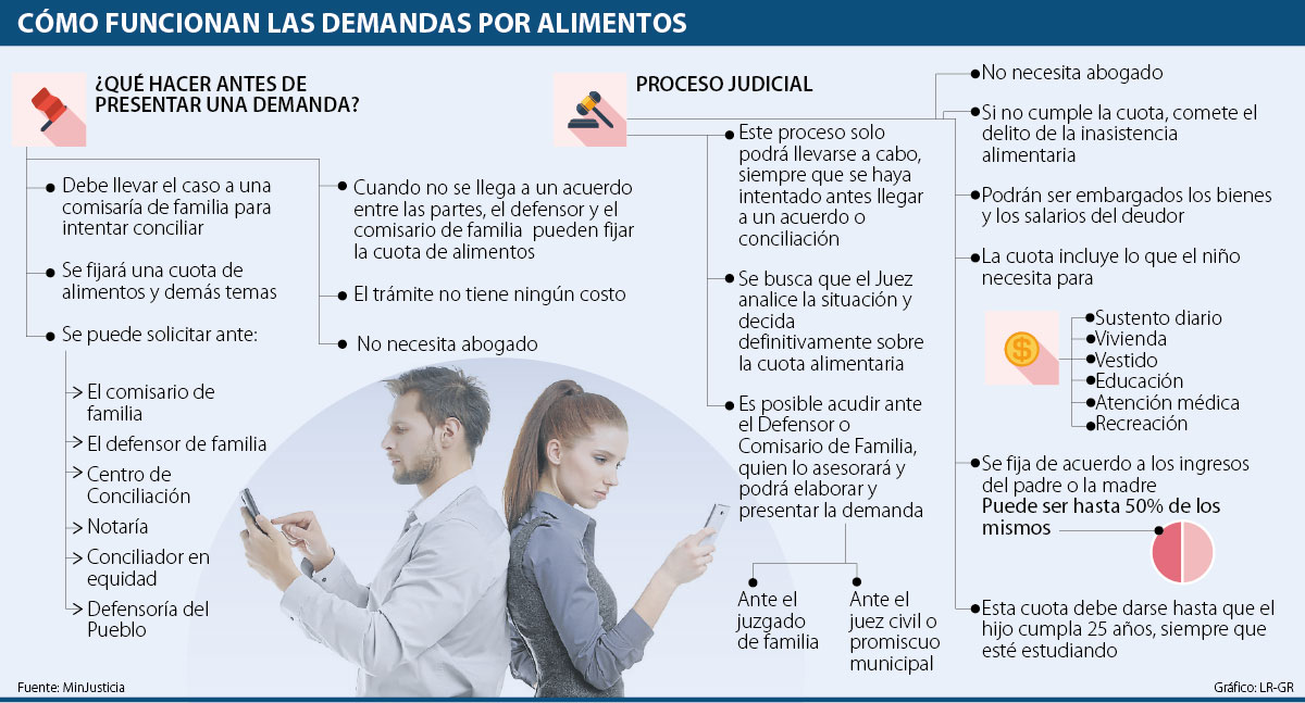 Lo primero que se debe hacer, según la Ley, es acudir a la Comisaría de Familia, la Defensoría de Familia, la Defensoría del Pueblo o la Personería Municipal con la otra parte, para llegar a una conciliación y acordar una cuota mensual, que podría llegar a ser, dependiendo del sueldo y el número de hijos, hasta de 50% de los ingresos del padre.