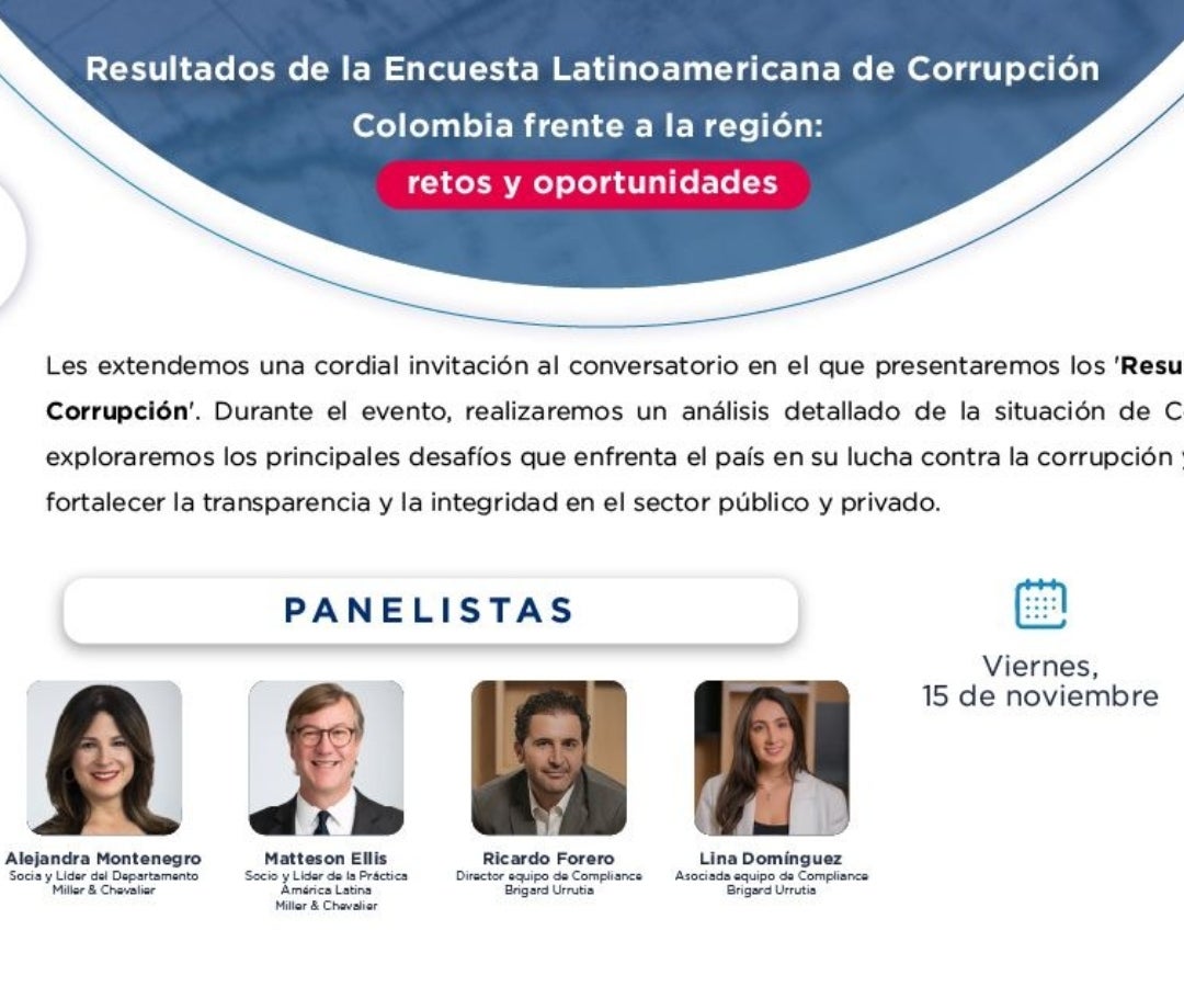 El evento, organizado por Brigard Urrutia y Miller&Chevalier, realizará un análisis detallado de la situación de Colombia en comparación con la región, y se explorarán los principales desafíos que enfrenta el país en su lucha contra la corrupción.