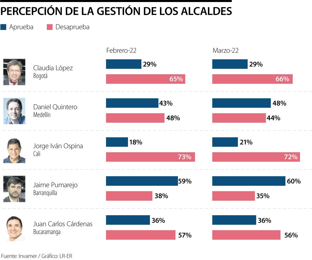 La alcaldesa de Bogotá, Claudia López , es el la única que no ha bajado en los índices de desaprobación, con un porcentaje de 66%
